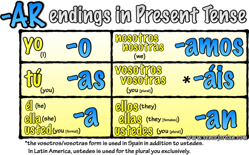 Spanish verbs are divided into three main groups according to their ending -AR, -ER or -IR. The Spanish verbs with -AR are the biggest category (around 80% of all) and the good news is that more of them are regulars. To conjugate these verbs, just remove the ending (-ar) and then add the corresponding termination according to the subject pronoun (yo, tú, él, usted...)